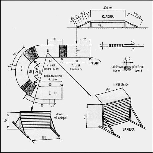 Na druhém úseku ve vzdálenosti 30 m od etapové čáry úseku se postaví bariéra pro chlapce o výšce 150 cm, nebo bariéra pro dívky a mladší kategorii o výšce 80 cm (případně příčné břevno).